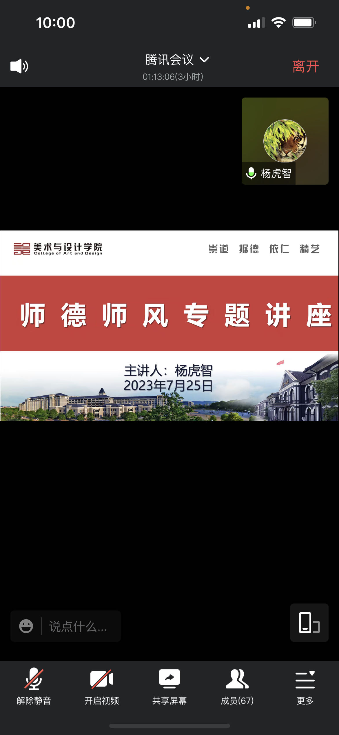 2023年7月25日上午,麻豆av 师德师风专题党课在腾讯会议开讲,主讲人为院党委书记杨虎智,美设院全体教师参加。