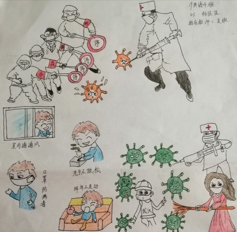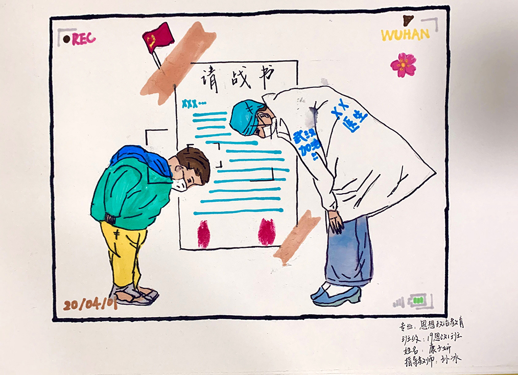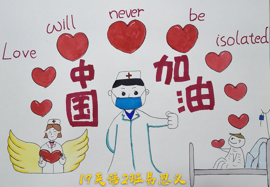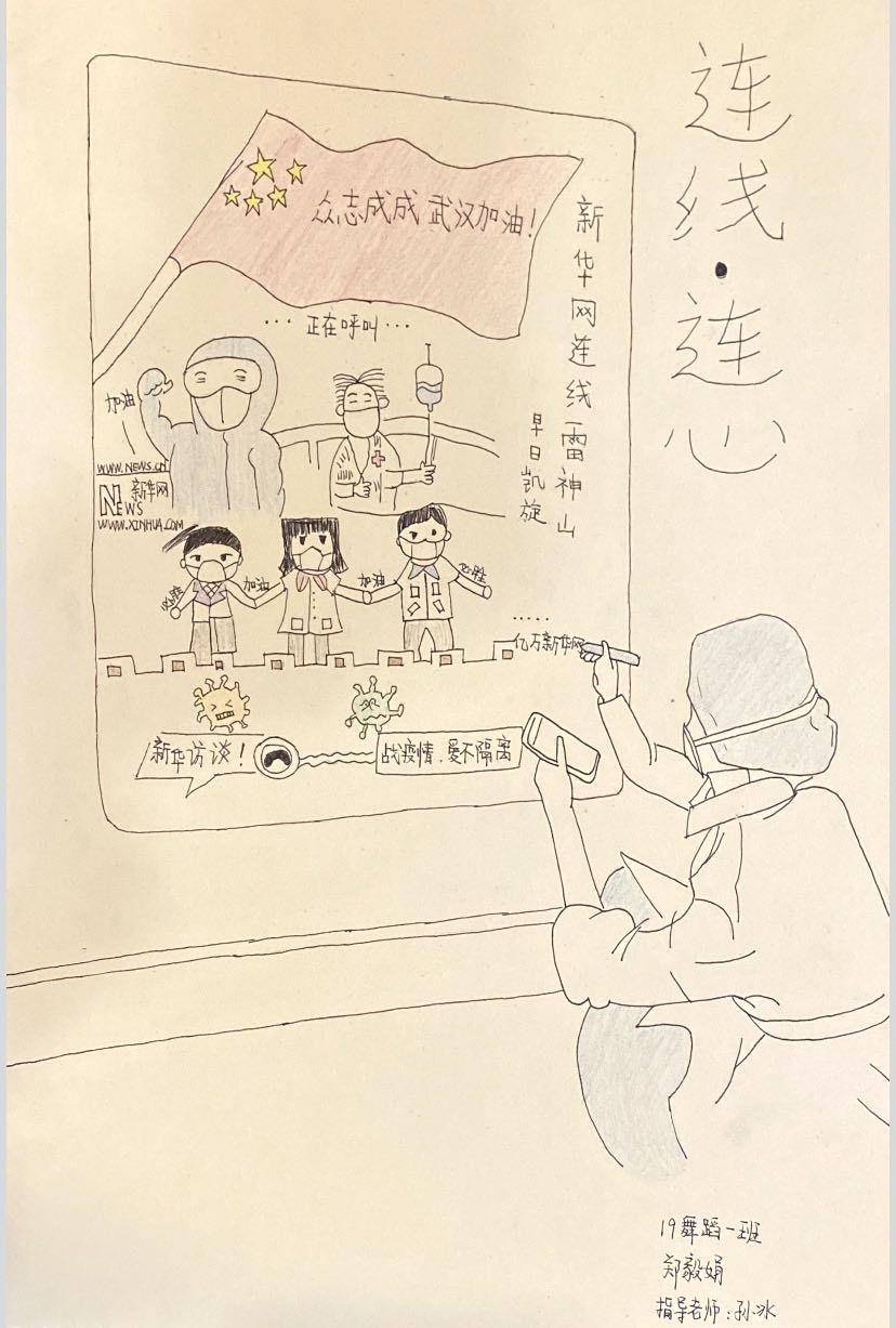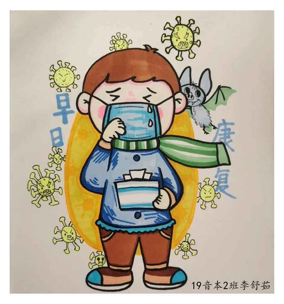 简笔画教学是《美术基础》课程内容中的重要组成部分,教学重点在于加强师范生的简笔画绘画技能,提高美术素养与多元化教学能力,为今后的教学实践打下基础。这次主题创作活动是课程组孙冰、曾素艳、谭媛元、吴瑕、易琼娟五位教师共同探究新时代课堂教学中“课程思政”的一次教学实践。针对抗击疫情期间师生们对抗疫进展与社会现象的关注,结合美术创作“以人民为中心”的指导思想,课程组五位教师通过多次研讨课程内容与授课方式,决定结合慕课平台线上教学进度与课程内容,组织所授班级包括科教、体育、音乐、应数等十个专业926名学生(师范类非美术学专业)共同参与“战疫情·爱不隔离”简笔画主题创作。同学们在掌握简笔画学习与表现规律的同时,将抗疫期间的英雄事迹、感人镜头用画笔展现,将感动之情运用隐喻、借喻、拟人或直抒胸臆等多种手法表现,表达青年的爱国情怀与内心感悟。课程组五位教师在十个班级中选出了75幅优秀作品进行线上展览,呈现出不同学科专业学生们凭借艺术的力量以“艺”抗“疫”。