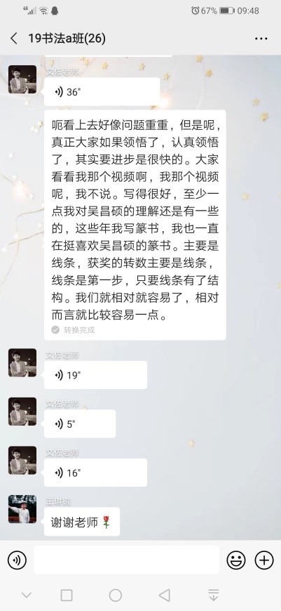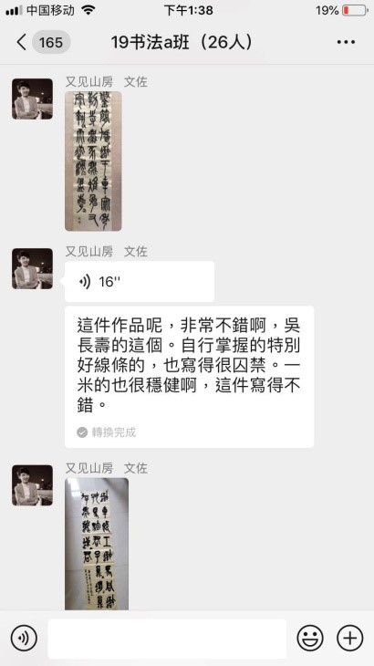 根据课程需要和实际情况,文佐老师利用简便易操作的微信平台拓展课程深度。文佐老师将示范视频精心录制成短视频,每个字都是一个单独的视频;示范过程讲解内容充实,虽只有一个字,但文佐老师将其中包含的技法和道理都能鞭辟入里,学生很受启发。学生课后也可以反复观看进行练习,很好的保证了教学质量。