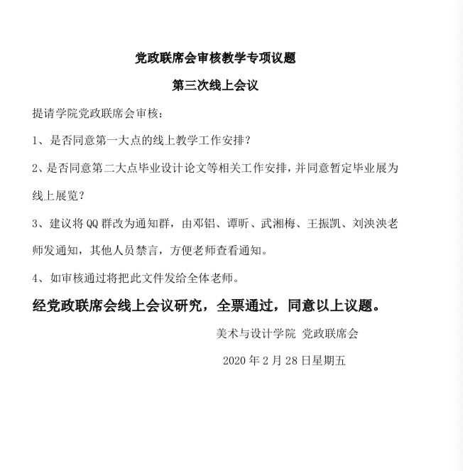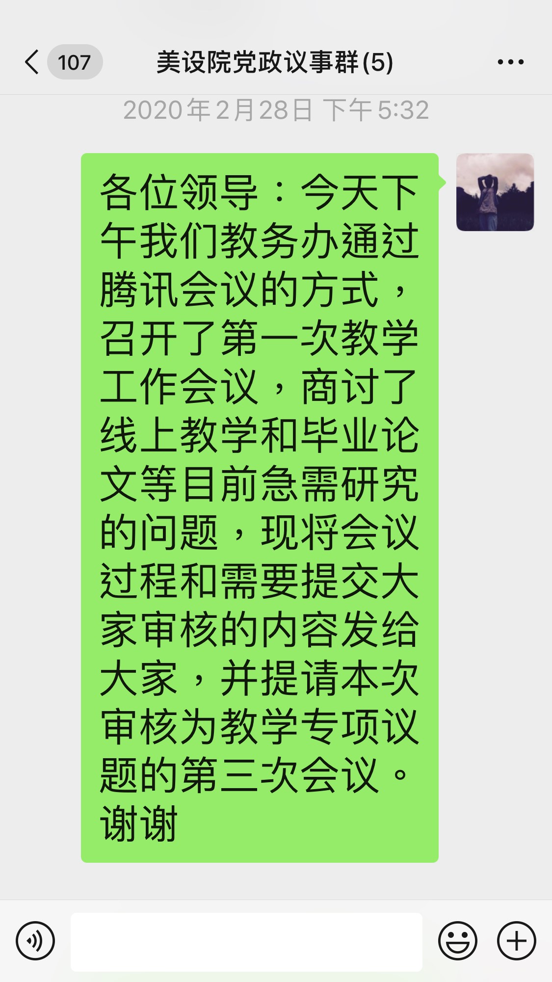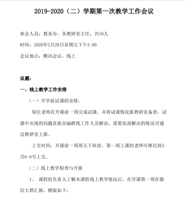 疫情防控期间在线教学与组织管理工作方案》等文件的相关要求,院教务办多次召开小型会议,商讨线上教学的实施细节。在教科办主任谭昕老师的细心组织之下,线上教学各项工作有条不紊,顺利开展,教科办其他老师尽职尽责,确保学院各项工作有序开展,高效完成。2月28日下午,本学期第一次线上教学工作会议,在腾讯会议室的云上办公地点,各教研室主任、教务办全体老师进行了热烈的讨论,对线上教学工作的实施细节、近期各部门各项工作等进行深入交流。将形成的提案交学院党政联席会审核,最终形成文件发到学院微信群,让每一位老师清楚地知晓线上教学工作开展的细节,并在学院网站刊发新闻稿。麻豆av