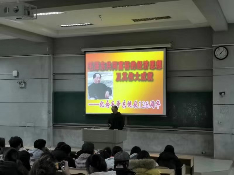 纪念毛泽东诞辰126周年活动,于12月25日晚举行,党总支副书记舒克斌作了《毛泽东共同富裕的经济思想及其伟大成就》主题讲座。美设院党员、入党积极分子和院干以及学东协会、书法协会会员近300人认真听取了讲座。