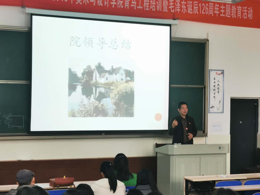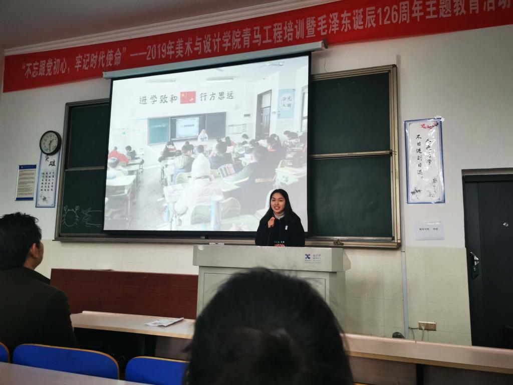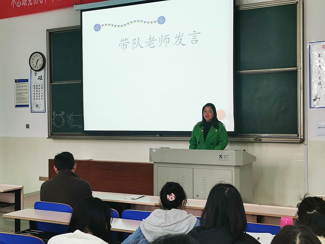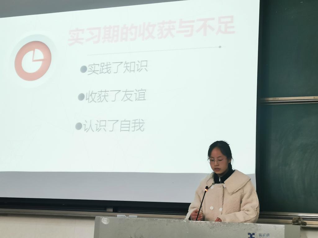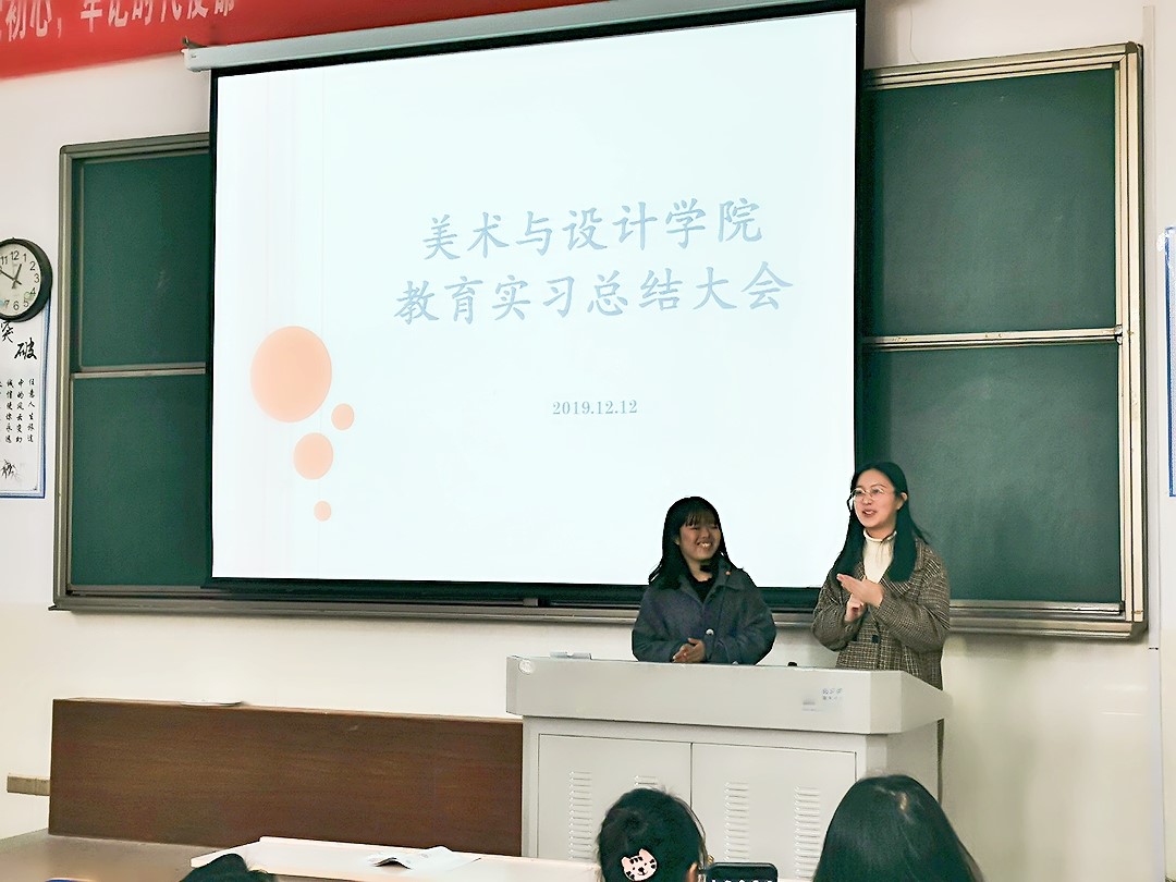 接下来由两位班长总结了此次实习情况。美教761班班长何超群讲述了这次实习生活中收获了知识和友谊、认识了自我。美教762班班长贺砚玲通过问卷调查的方式了解本班实习情况,做出量化总结。她对于未来提出一些努力方向,在音乐背景声中完成了生动的总结。