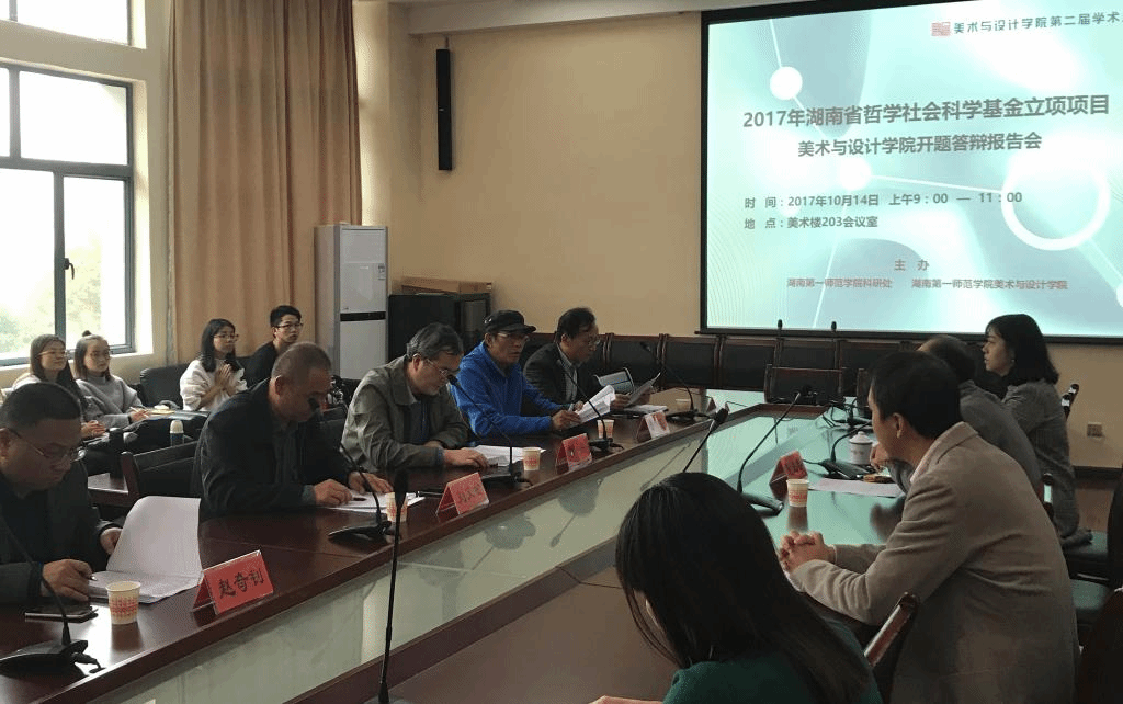 开题答辩报告会在美术楼会议室召开。我校副校长曹兴教授、湖南师范大学美术学院谢雱教授、中南林业科技大学家具与艺术设计学院院长刘文金教授、湖南理工学院美术学院党总支书记洪琪教授、我校科研处处长赵奇钊教授作为答辩专家出席了报告会。会议由麻豆av