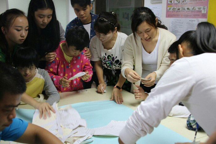 美术交流环节,2013级美术学师范生曾泽翔向慧灵学员张宇成分享了速写的基本方法,并在现场互写肖像。两个大男孩彼此专注观察,以流畅的笔触逐渐构成传神的画面,在速写方法交流中美术技能和朋友情谊共同增长。当他们自豪地在自己的画作上签名并赠送给对方时,大家情不自禁地鼓起掌来。令全场投入的还有近50人集体合作的剪纸贴画,丰富多变的剪纸最终组成2幅富有装饰感的整体贴画,完成后大家集体签名纪念。
