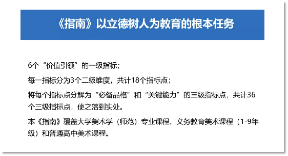 会上发布了《美术学科大中小一体化“课程思政”指南》,华东师范大学美术学院教授、项目顾问钱初熹对该指南进行了解读。她阐述了基于构建“价值引领、必备品格、关键能力”三位一体美术学科课程思政理念与设计思路,强调了美术学科需要发挥感性认知的特征,以及在大中小各阶段、各环节之间要精准对接。