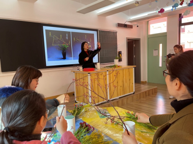 吕紫薇老师带来了一场精彩的插花艺术课堂。课上,老师先向大家介绍了她插花的初衷,即五“心”好评:耐心、静心、虚心、关心、开心;随后系统介绍了中国插花的四大类型:写景花、理念花、心象花、造型花;最后带领老师们进行瓶花创作。老师们在吕紫薇老师的耐心指导下,积极实践,巧妙构思,将自己的创意转化为一件件高低错落、疏密有致,兼具自然美和生活美的艺术品。