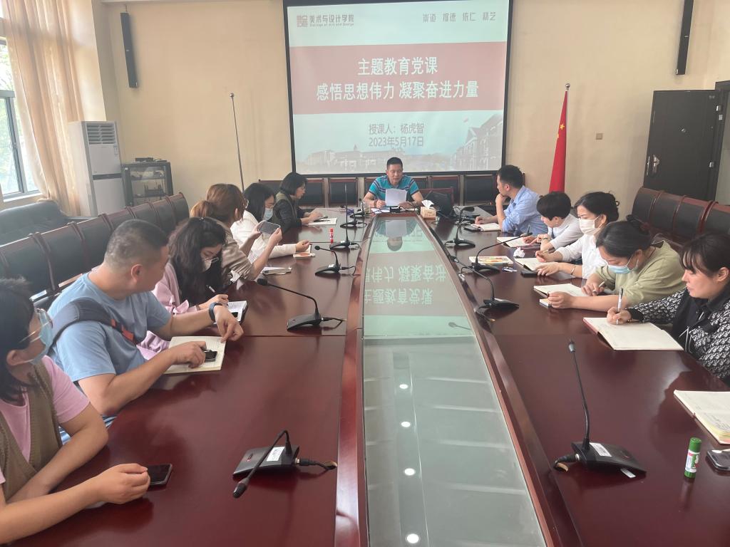 杨虎智要求,全院上下要以主题教育为契机,在学习中感悟思想伟力,在实践中凝聚奋进力量,把学习实践成果转化为坚定的理想信念,转化为过硬的工作本领,转化为创新的思路举措,转化为强烈的责任担当,务必结合学院发展目标和定位,把握好学科发展和专业发展方向,不断提高人才培养质量,在落实学校办学新理念、推进“四个一师”建设,建设特色鲜明的师范类大学做出美院贡献!