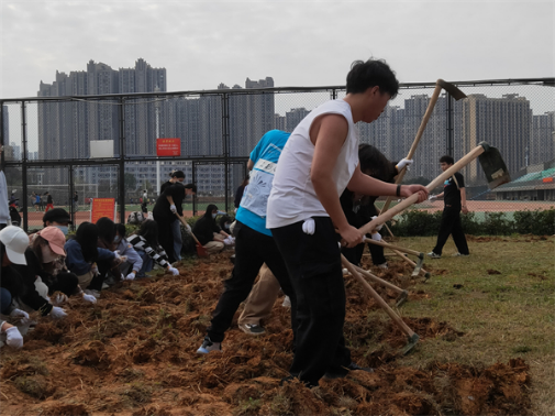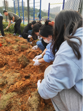 从学校基建与后勤处认领了一块300平米的草地,学生主要负责挖土、翻地、除杂草草根,完成后计校园公益性劳动3学时。此后,校园内草地养护、树木养护、垃圾分类、白色垃圾的监督及处理等也会计校园公益性劳动学时。