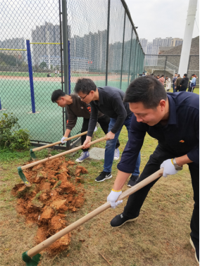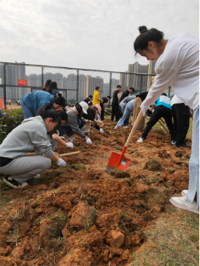 的学生志愿者们,我们没有采取其他院的分块承包办法,而是齐心协力、集体作战,一排男生在前挖土翻地,一排女生在后除杂草草根,成为活动现场最靓丽的风景线。