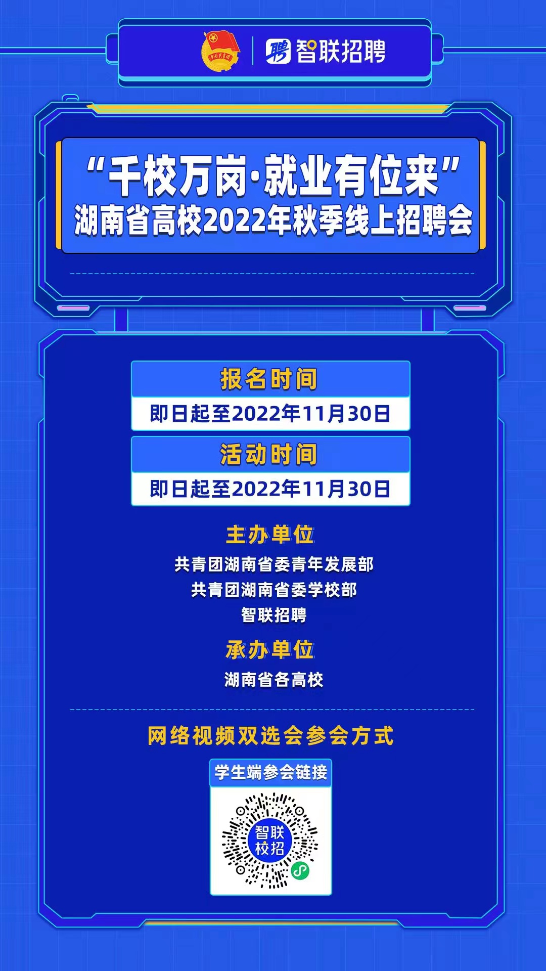 共青团“千校万岗 就业有位来”湖南省高校2022年秋季线上招聘会 发布时间:2022-11-03 作者: 浏览次数: 为切实帮助大学生就业,共青团“千校万岗▪就业有位来”湖南省高校2022年秋季线上招聘会活动时间将持续到2022年11月30日。这次空中双选会,有90%以上是大企业和知名企业。毕业生扫描海报二维码即可参加。