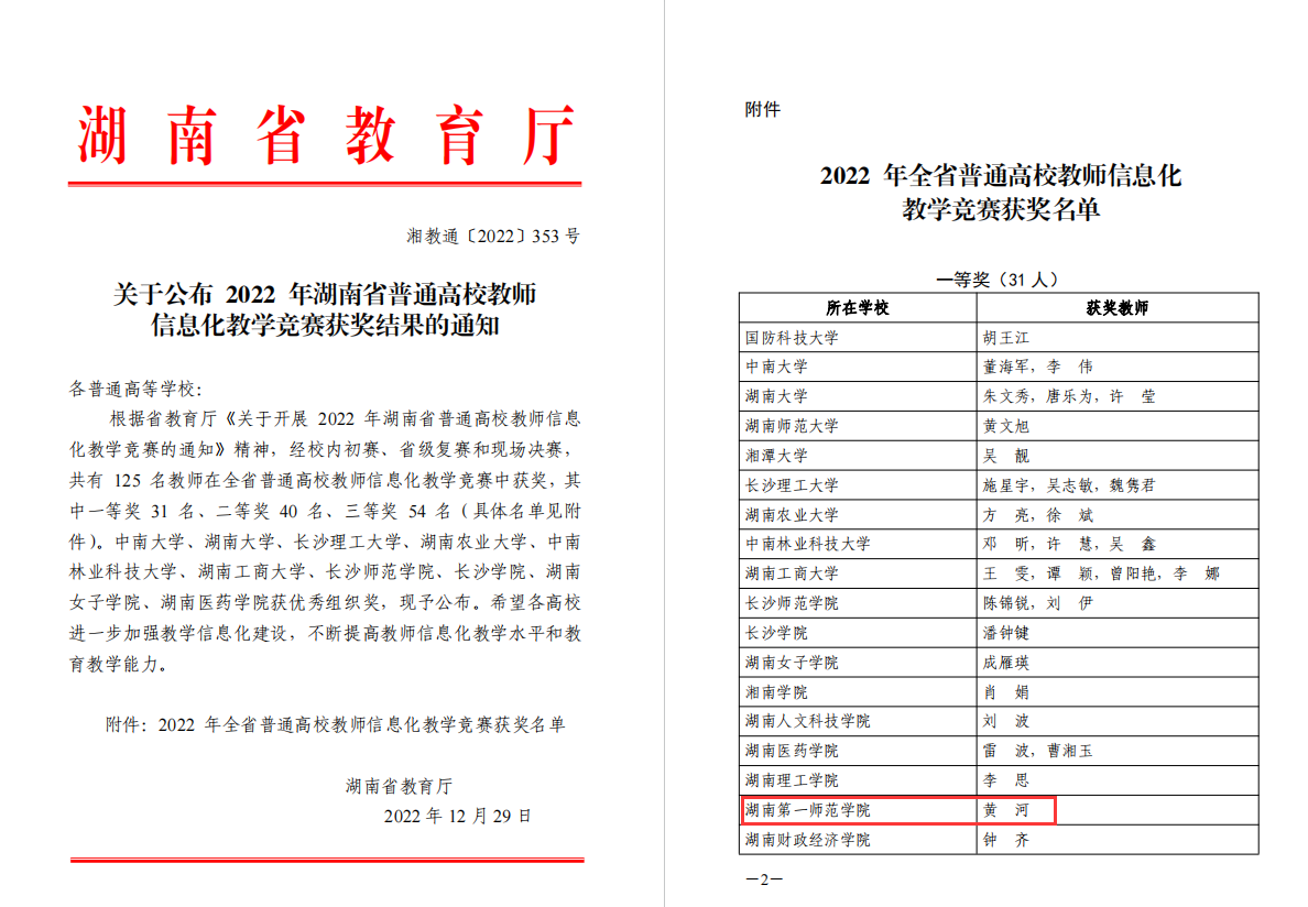 12月18日,2022年湖南省普通高校教师信息化教学竞赛决赛以线上形式举行。根据《湖南省普通高校教师信息化教学竞赛章程》规定,经初赛、复赛和线上决赛,在来自中湖南省52所普通高校的160位参加省复赛教师中,共有54位选手进入省决赛,评选出一等奖31名。麻豆av